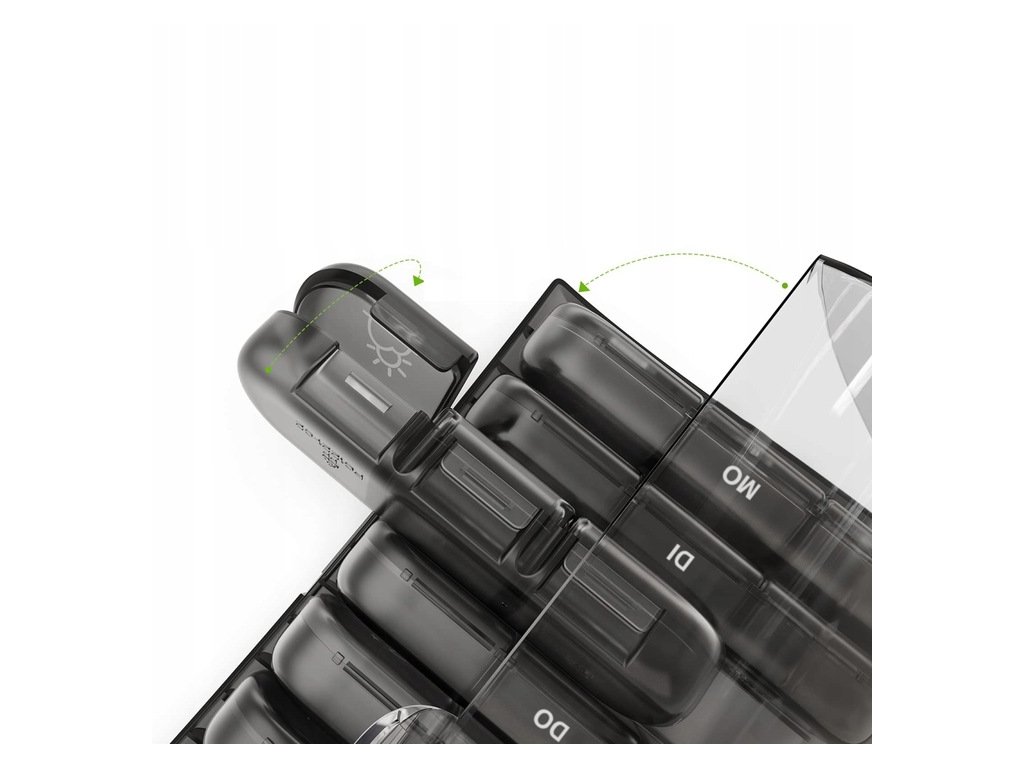- Díky tomu můžete snadno uspořádat své léky na celý týden, což pomáhá vyhnout se chybám a zajišťuje, že nezapomenete na žádnou dávku. Každou nádobu lze vyjmout samostatně, což usnadňuje přenášení léků s sebou, například do práce nebo na výlet.